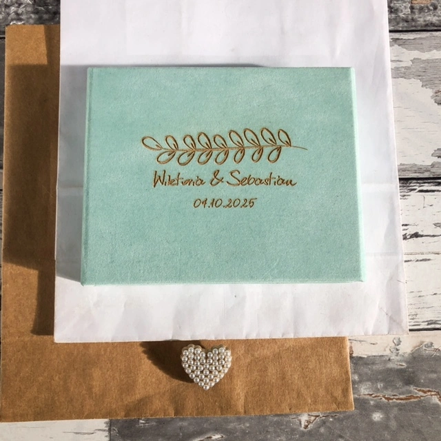 Pudełko wykonano z grubego kartonu pokrytego miękkim, miętowym zamszem. Delikatny welur przyjemny w dotyku subtelnie mieni się pod światło, zmieniając tonację w zależności od ułożenia włosia. Pastelowy kolor dodaje całości lekkości i świeżości – idealny na ślub, chrzest, komunię czy inne wyjątkowe okazje.